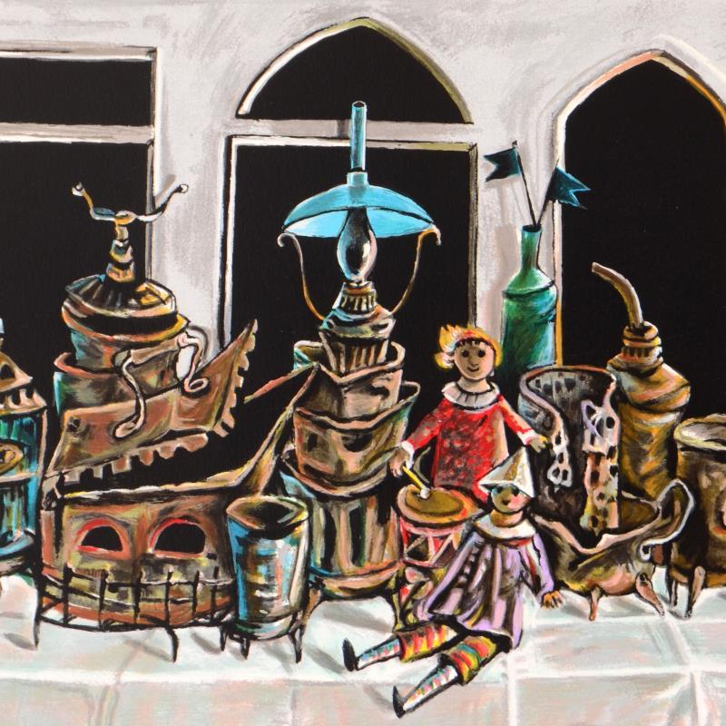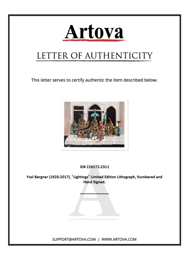 "Lightings" is a limited edition lithograph on paper, numbered hand-signed by Yosl Bergner (1920-2017). Includes Certificate of Authenticity. Measures approx. 28.5" x 21" (with border), 25.5" x 18.5" (image).