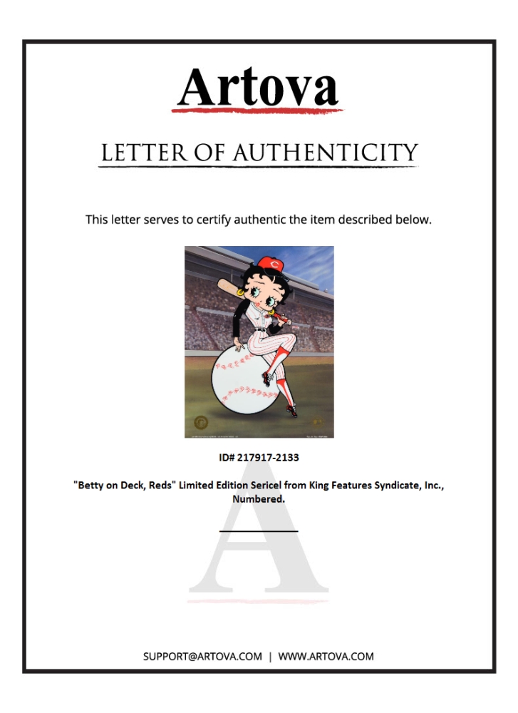 "Betty on Deck - Reds" is a limited edition sericel with background from King Features Syndicate, Inc, numbered and bearing King Features' official seal. Measures approximately 13" x 17" (background), 11" x 14" (cel).