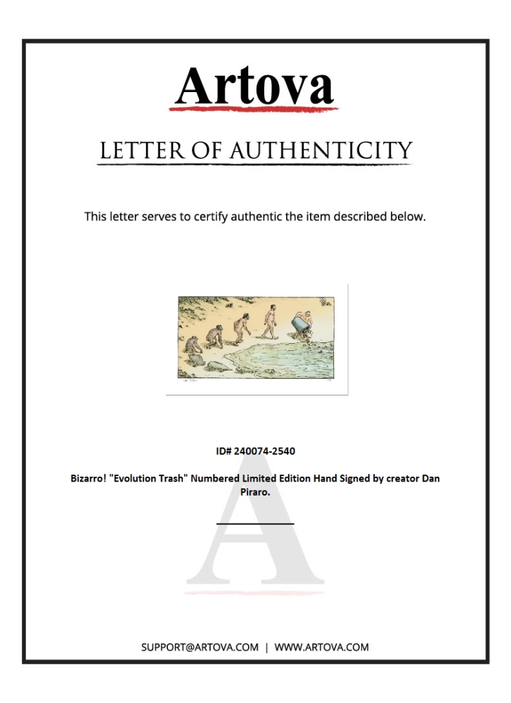 "Evolution Trash" is a limited edition giclee on paper by Dan Piraro, creator of the critically acclaimed and award winning comic strip, Bizarro! This piece is numbered and hand signed by the artist and includes aletterof authenticity. Measures approximtely 8" x 15" (image).