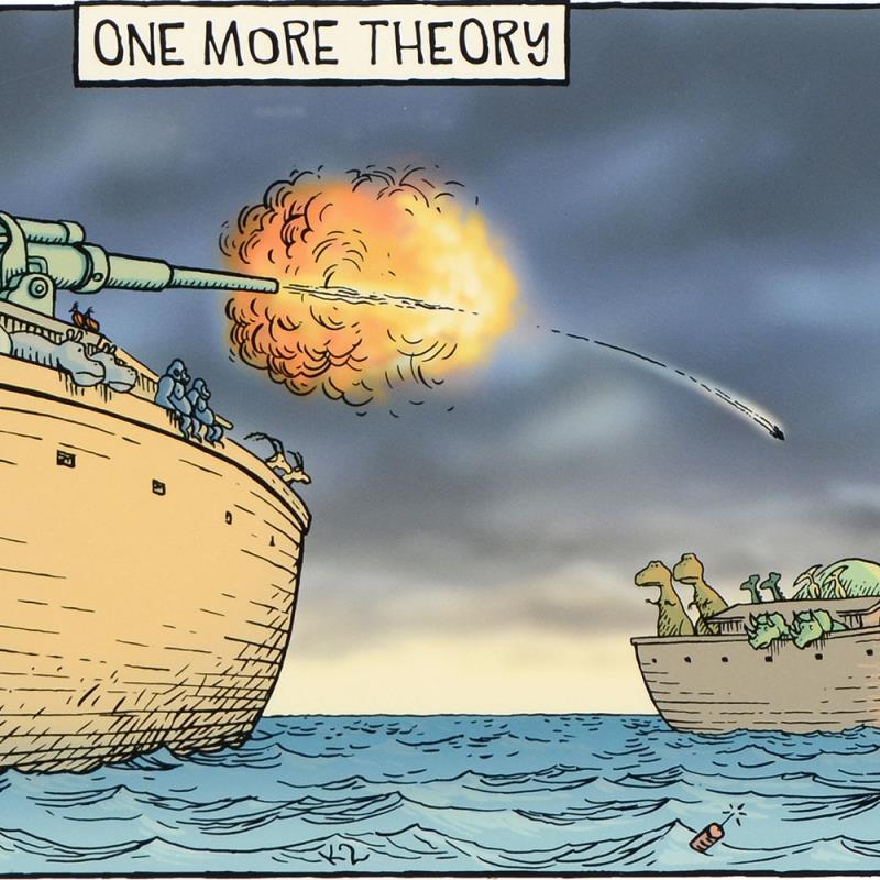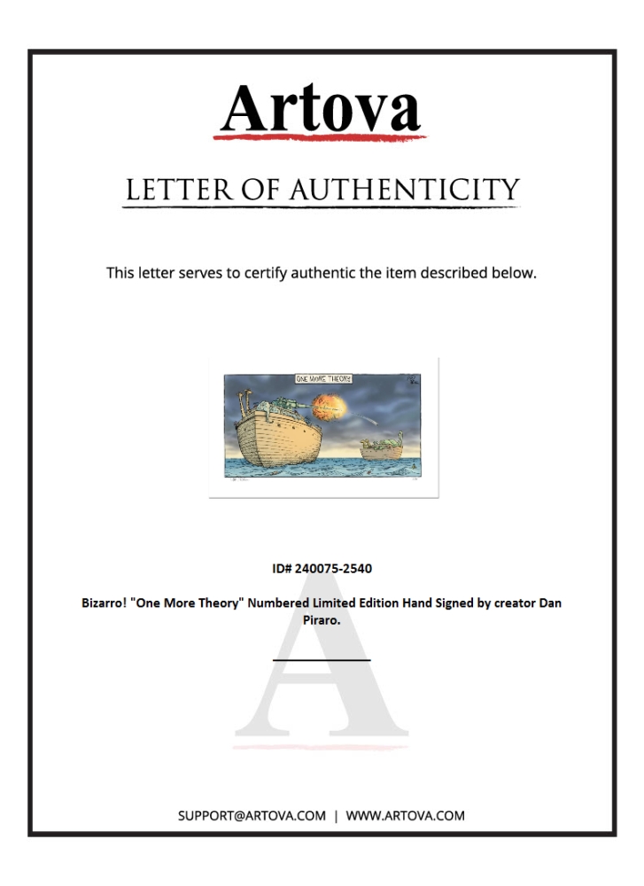 "One More Theory" is a limited edition giclee on paper by Dan Piraro, creator of the critically acclaimed and award winning comic strip, Bizarro! This piece is numbered and hand-signed by the artist and includes aletterof authenticity. Measures approximtely 8" x 15" (image).