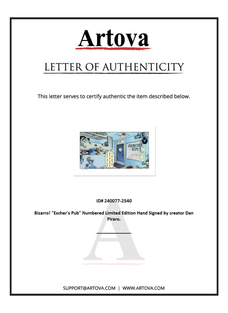 "Escher's Pub" is a limited edition giclee on paper by Dan Piraro, creator of the critically acclaimed and award winning comic strip, Bizarro! This piece is numbered and hand-signed by the artist and includes a letter of authenticity. Measures approximately 8" x 15" (image).