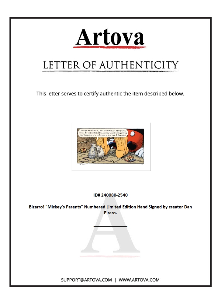 "Mickey's Parents" is a limited edition giclee on paper by Dan Piraro, creator of the critically acclaimed and award winning comic strip, Bizarro! This piece is numbered and hand signed by the artist and includes aletterof authenticity. Measures approximtely 8" x 15" (image).