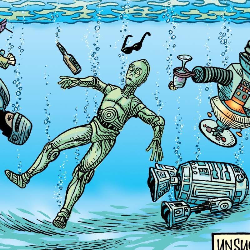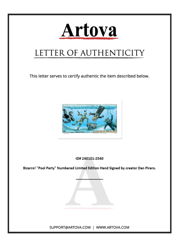 "Pool Party" is a limited edition giclee on paper by Dan Piraro, creator of the critically acclaimed and award winning comic strip, Bizarro! This piece is numbered and hand signed by the artist and includes aletterof authenticity. Measures approximtely 8" x 15" (image).