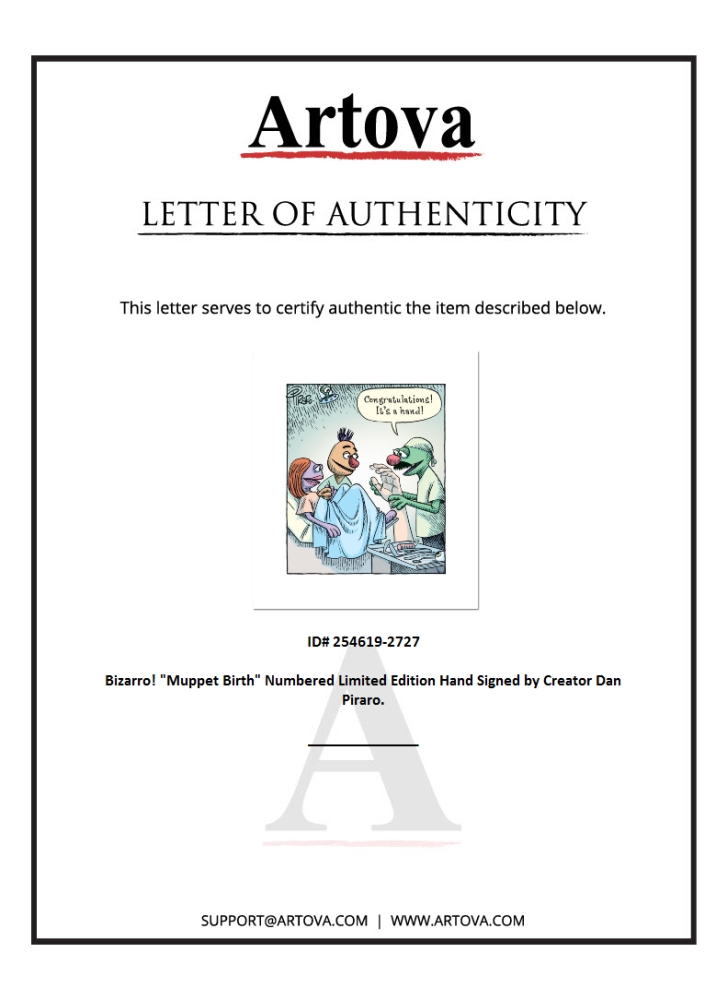 "Muppet Birth" is a limited edition giclee on paper by Dan Piraro, creator of the critically acclaimed and award winning comic strip, Bizarro! This piece is numbered and hand signed by the artist and includes a letterof authenticity. Measures approximtely 8" x 15" (image).