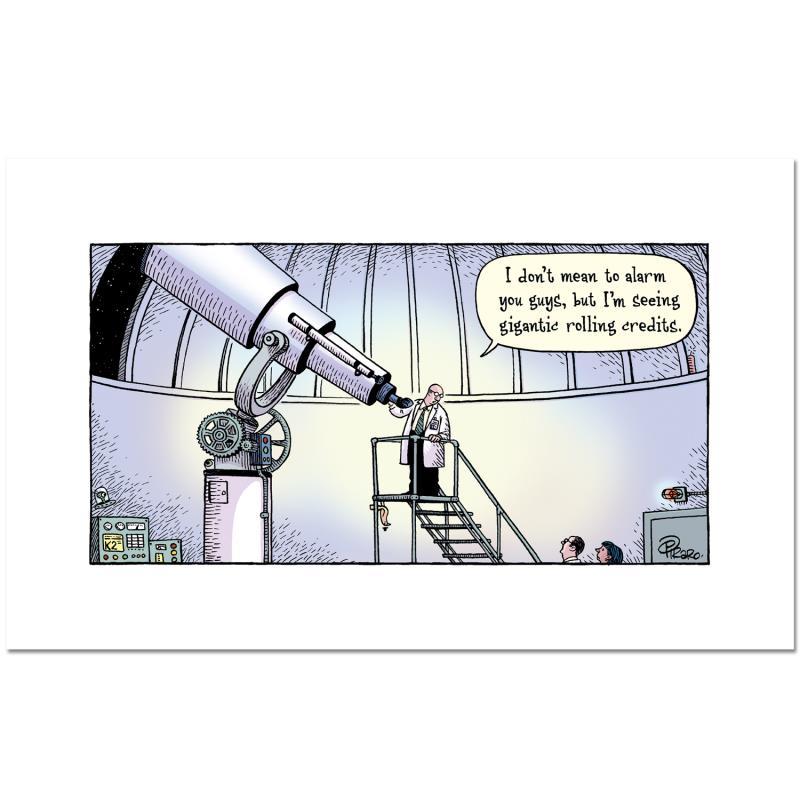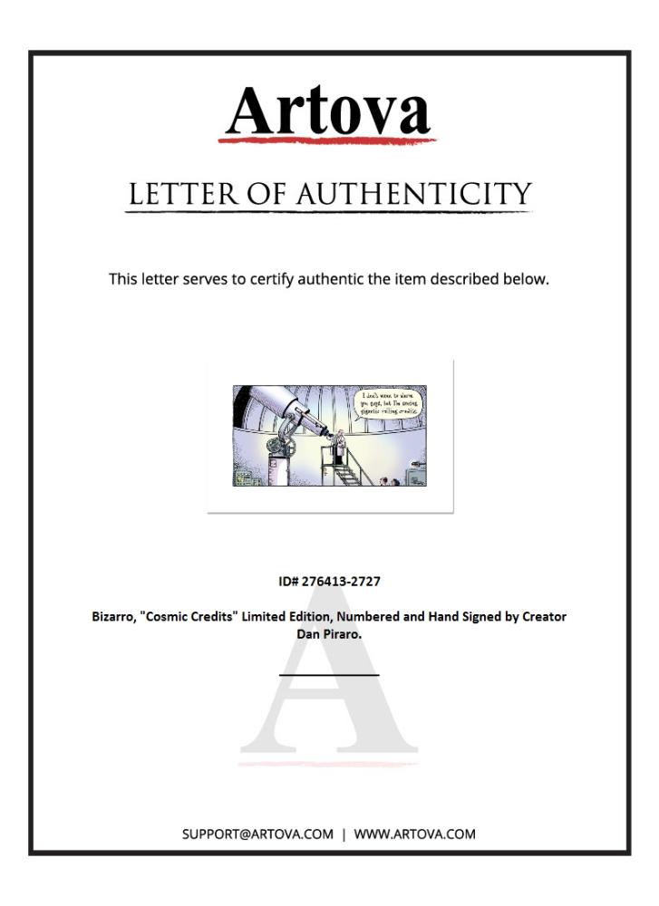 "Cosmic Credits" is a limited edition giclee on paper by Dan Piraro, creator of the critically acclaimed and award winning comic strip, Bizarro, numbered and hand signed by the artist. Includes Letter of Authenticity. Measures approx. 12" x 19" (border), 8" x 15" (image).