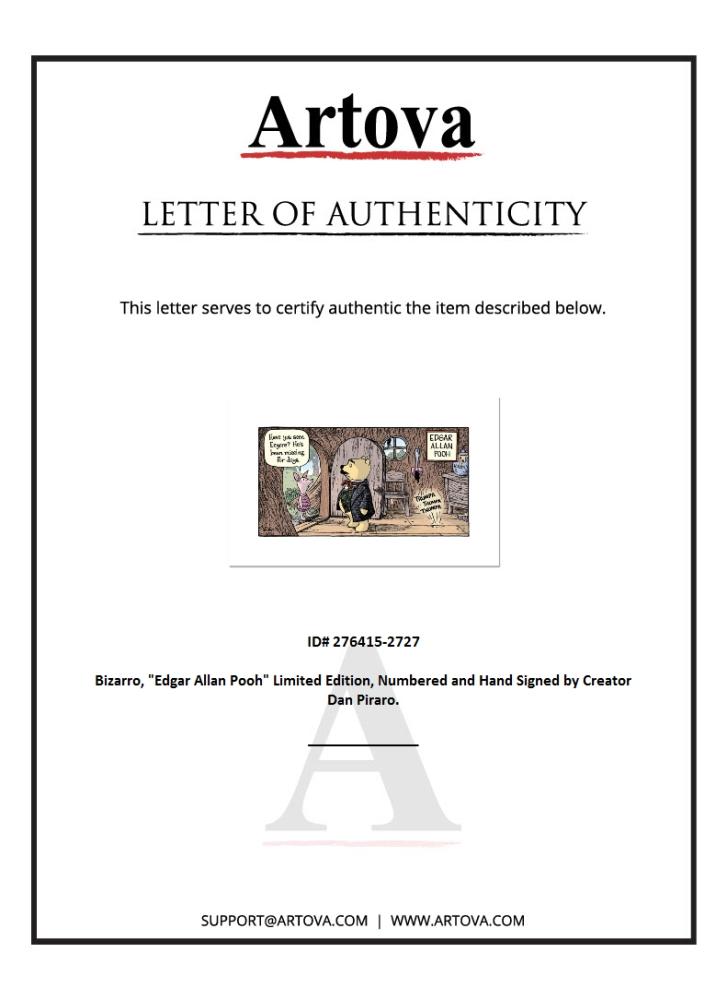 "Edgar Allan Pooh" is a limited edition giclee on paper by Dan Piraro, creator of the critically acclaimed and award winning comic strip, Bizarro, numbered and hand signed by the artist. Includes Letter of Authenticity. Measures approx. 19" x 19" (border), 8" x 15" (image).