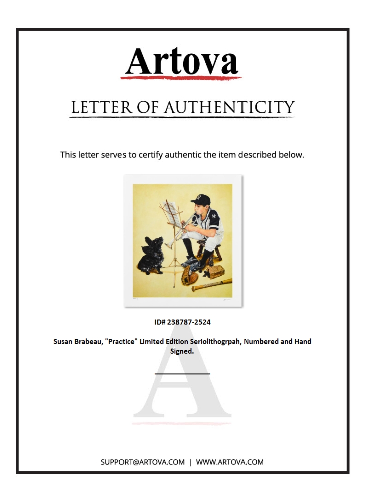 "Practice" is a limited edition seriolithograph on paper by Susan Brabeau, numbered and hand-signed by the artist. Includes Letter of Authenticity. Measures approx. 19" x 21" (border), 16" x 18" (image).