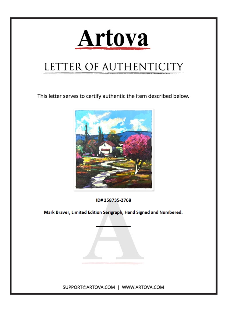 This is a limited edition serigraph on paper by Mark Braver. The piece comes hand-signed by the artist, numbered, and with a letter of authenticity. Measures approximately 7.5" x 7.5".