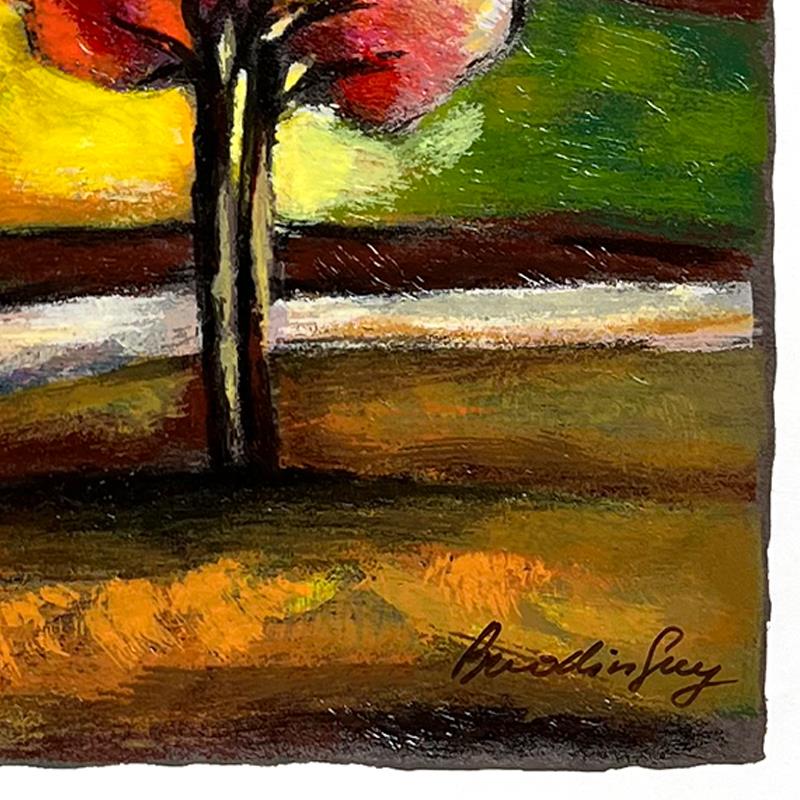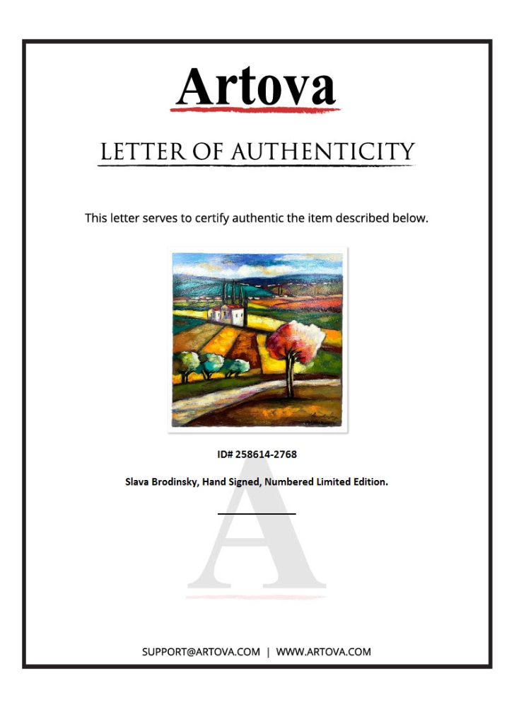 This is a limited edition serigraph on paper by Slava Brodinsky. The piece comes hand-signed by the artist, numbered, and with a letter of authenticity. Measures approximately 12" x 12".