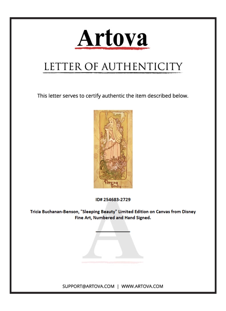 "Sleeping Beauty" is from a sold-out limited edition giclee on canvas by Tricia Buchanan-Benson, numbered and hand-signed by the artist. This piece is licensed by Disney Fine Art. Includes Letter of Authenticity. Measures approx. 12" x 24" (image).