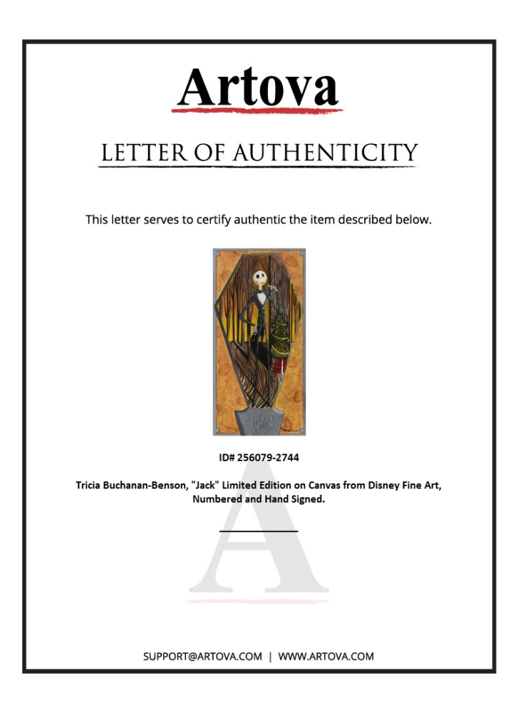 "Jack" is a limited edition giclee on canvas by Tricia Buchanan-Benson, numbered and hand-signed by the artist. This piece is licensed by Disney Fine Art. Includes Letter of Authenticity. Measures approx. 12" x 24" (image).