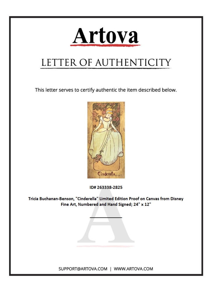 "Cinderella" is a limited edition proof giclee on canvas by Tricia Buchanan-Benson, numbered and hand signed by the artist. This piece is licensed by Disney Fine Art. Includes Letter of Authenticity. Measures approx. 12" x 24" (image).
