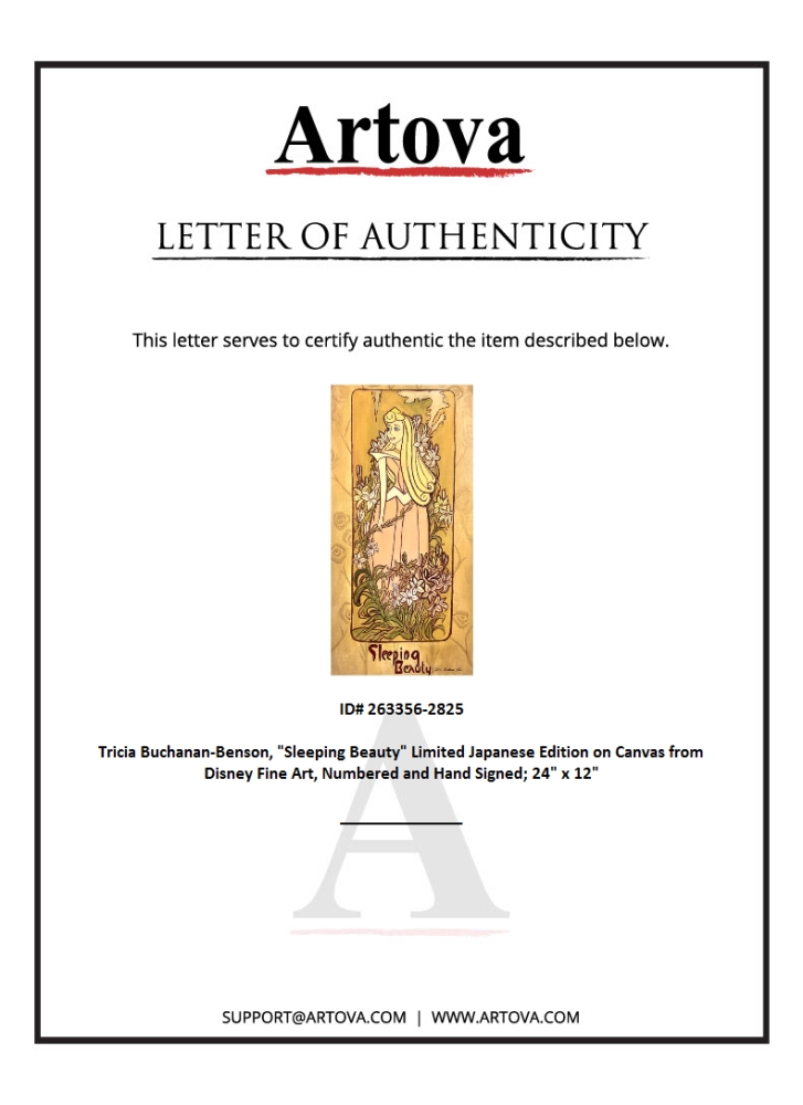 "Sleeping Beauty" is a limited Japanese edition giclee on canvas by Tricia Buchanan-Benson, numbered and hand signed by the artist. This piece is licensed by Disney Fine Art. Includes Letter of Authenticity. Measures approx. 12" x 24" (image).
