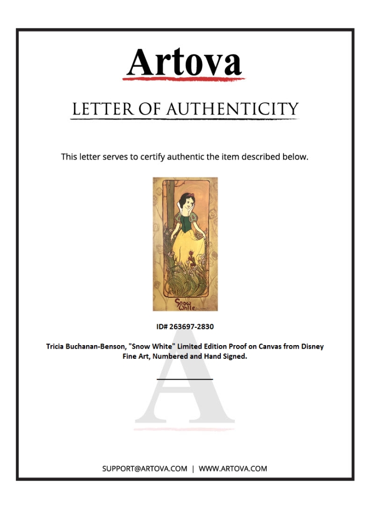 "Snow White" is a limited edition proof giclee on canvas by Tricia Buchanan-Benson, numbered and hand signed by the artist. This piece is licensed by Disney Fine Art. Includes Letter of Authenticity. Measures approx. 12" x 24" (image).