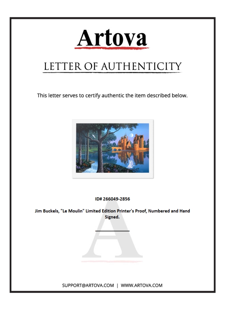 "Le Moulin" is a limited edition printer's proof serigraph on paper by Jim Buckels, numbered and hand signed by the artist. Includes Letter of Authenticity. Measures approx. 27.5" x 38" (border), 23" x 34" (image).