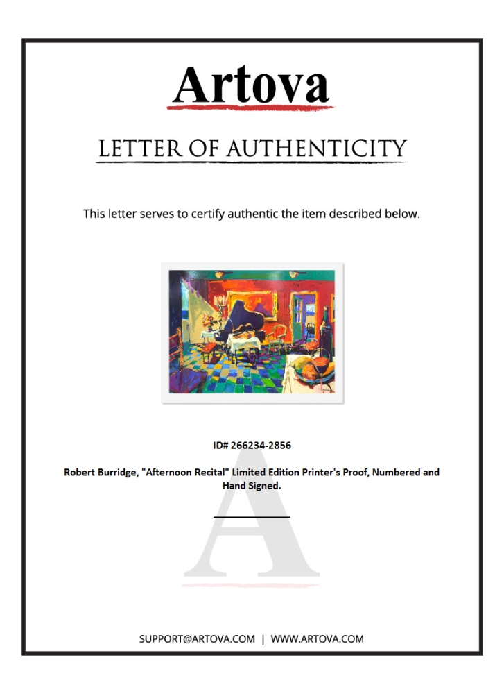 "Afternoon Recital" is a limited edition printer's proof serigraph on paper by Robert Burridge, numbered and hand signed by the artist. Includes Letter of Authenticity. Measures approx. 36.5" x 46.5" (border), 32" x 42.5" (image). There are very minor creases on the corners that may be concealed when framed.