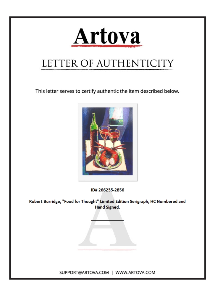 "Food for Thought" is a limited edition serigraph on paper by Robert Burridge, HC numbered and hand signed by the artist. Includes Letter of Authenticity. Measures approx. 42" x 32" (border), 36" x 27" (image).