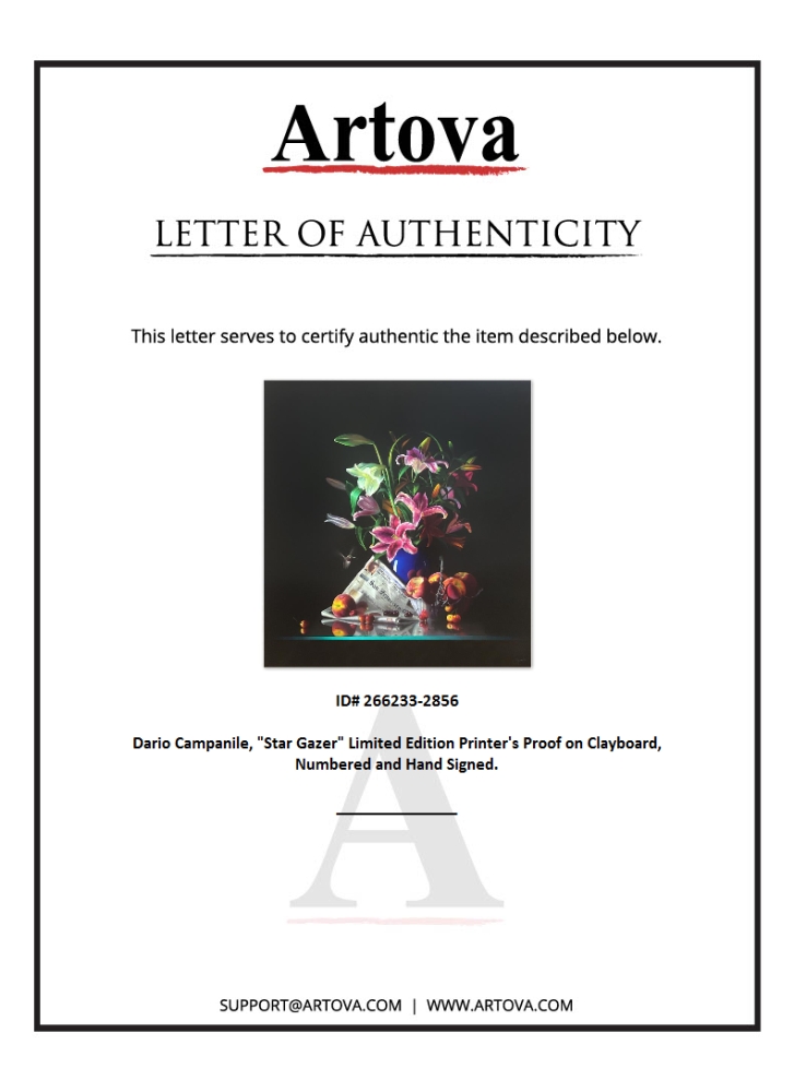 "Star Gazer" is a limited edition printer's proof serigraph on clay board by Dario Campanile, numbered and hand signed by the artist. Includes Letter of Authenticity. Measures approx. 32" x 30" (image).