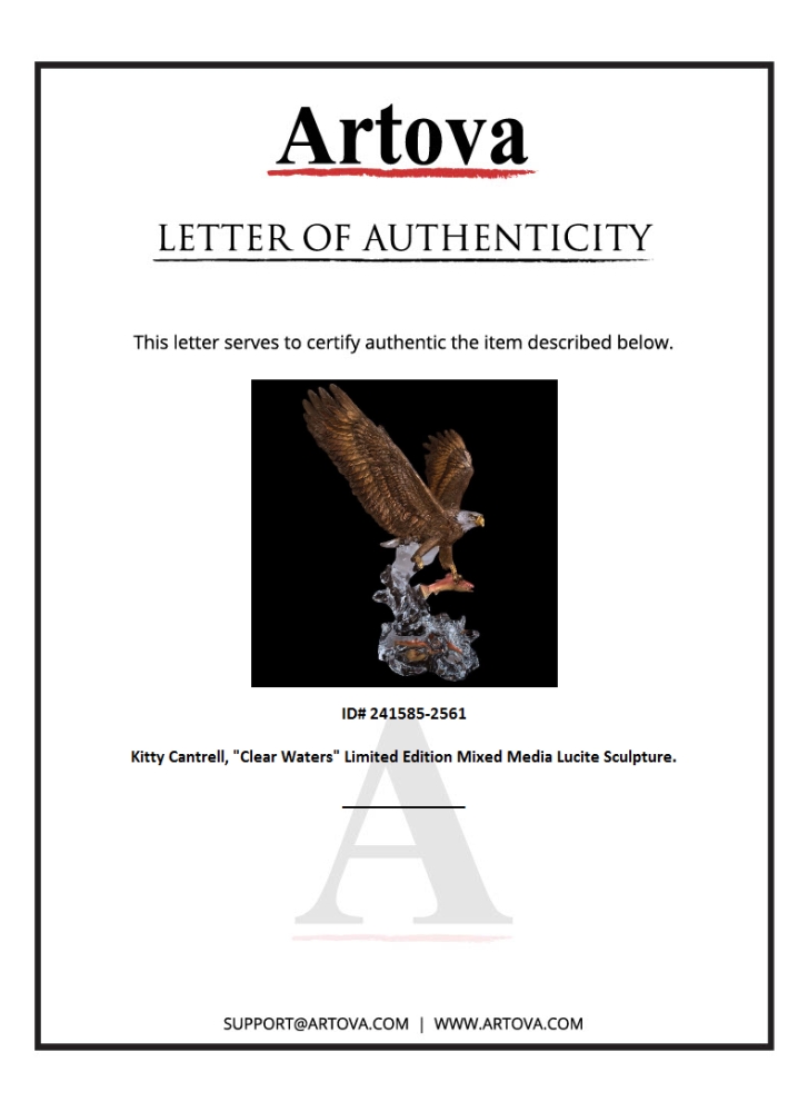 "Clear Waters" is a limited edition mixed media lucite sculpture by Kitty Cantrell. Engraved with the artists signature and number, this piece comes with a certificate of authenticity. Measures approximately 8" x 11" x 6.25".