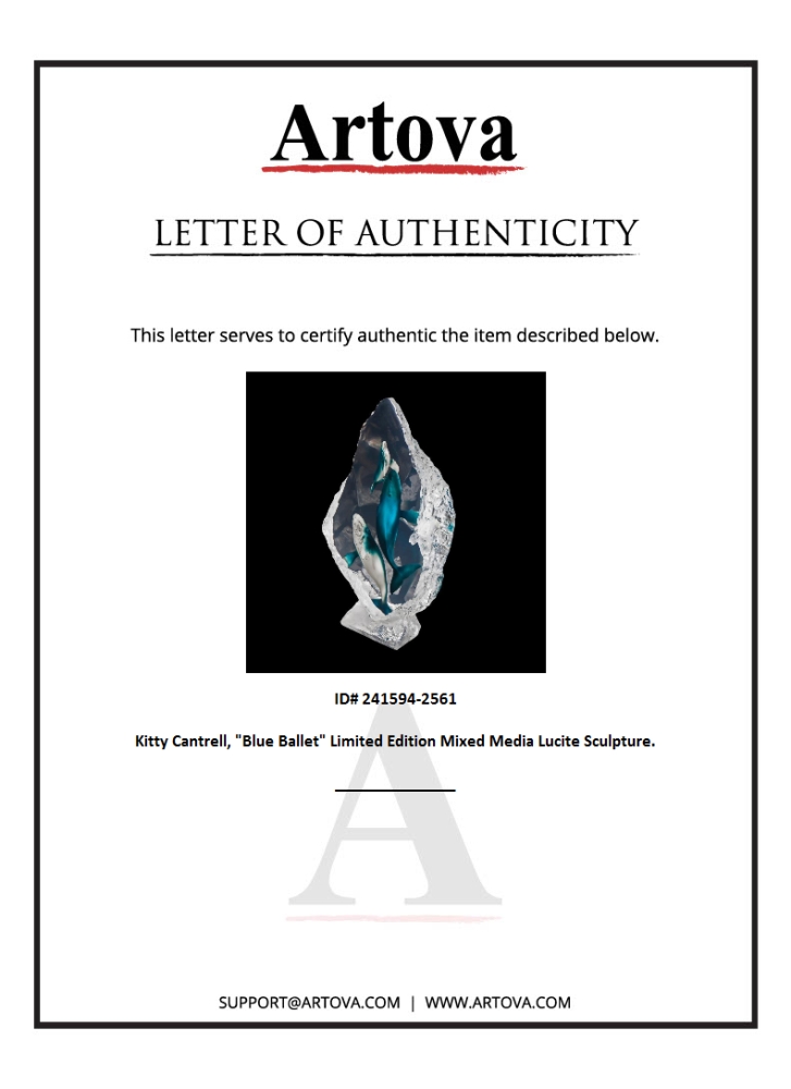 "Blue Ballet" is a limited edition mixed media lucite sculpture by Kitty Cantrell. Engraved with the artists signature and number, this piece comes with a certificate of authenticity. Measures approximately 11.5" x 23.5" x 7".