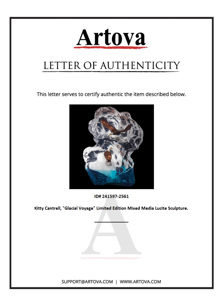"Glacial Voyage" is a limited edition mixed media lucite sculpture by Kitty Cantrell. Engraved with the artists signature and number, this piece comes with a certificate of authenticity. Measures approximately 11.5" x 15" x 7.5".