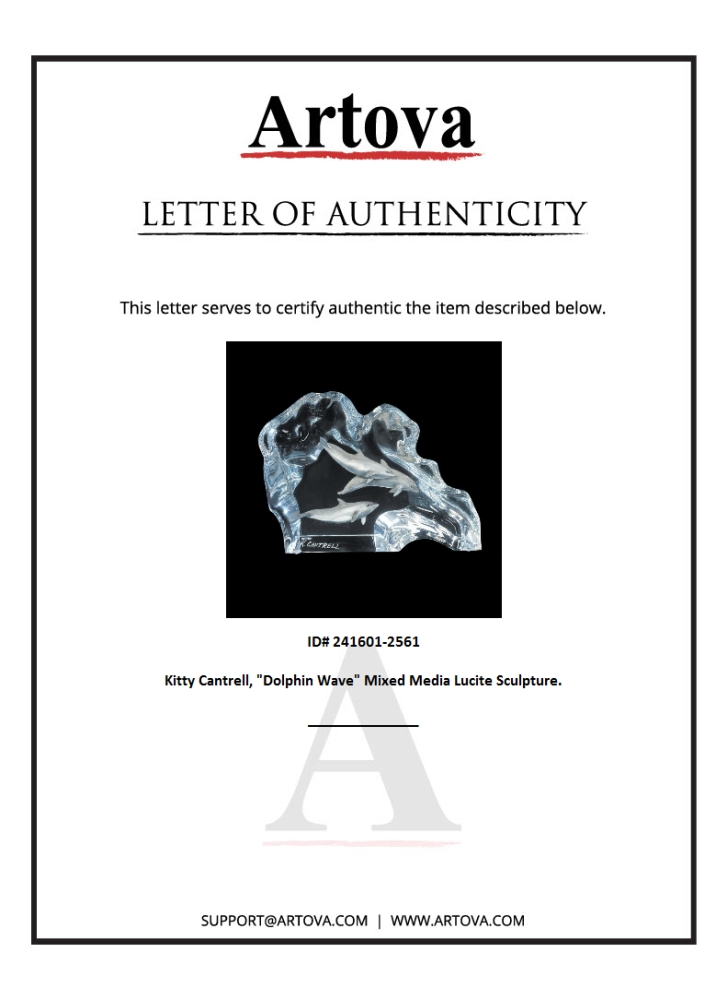 "Dolphin Wave" is a mixed media lucite sculpture by Kitty Cantrell. Engraved with the artists signature, this piece comes with a certificate of authenticity. Measures approximately 6.5" x 5" x 1.75".