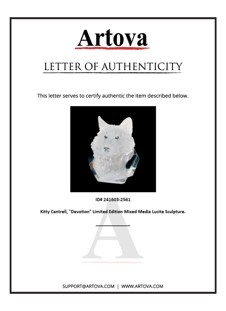 "Devotion" is a limited edition mixed media lucite sculpture by Kitty Cantrell. Engraved with the artists signature and number, this piece comes with a certificate of authenticity. Measures approximately 7" x 9" x 7.25".