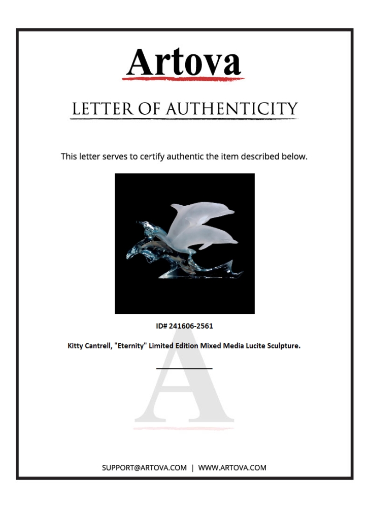"Eternity" is a limited edition mixed media lucite sculpture by Kitty Cantrell. Engraved with the artists signature and number, this piece comes with a certificate of authenticity. Measures approximately 15" x 9.5" x 6.25".