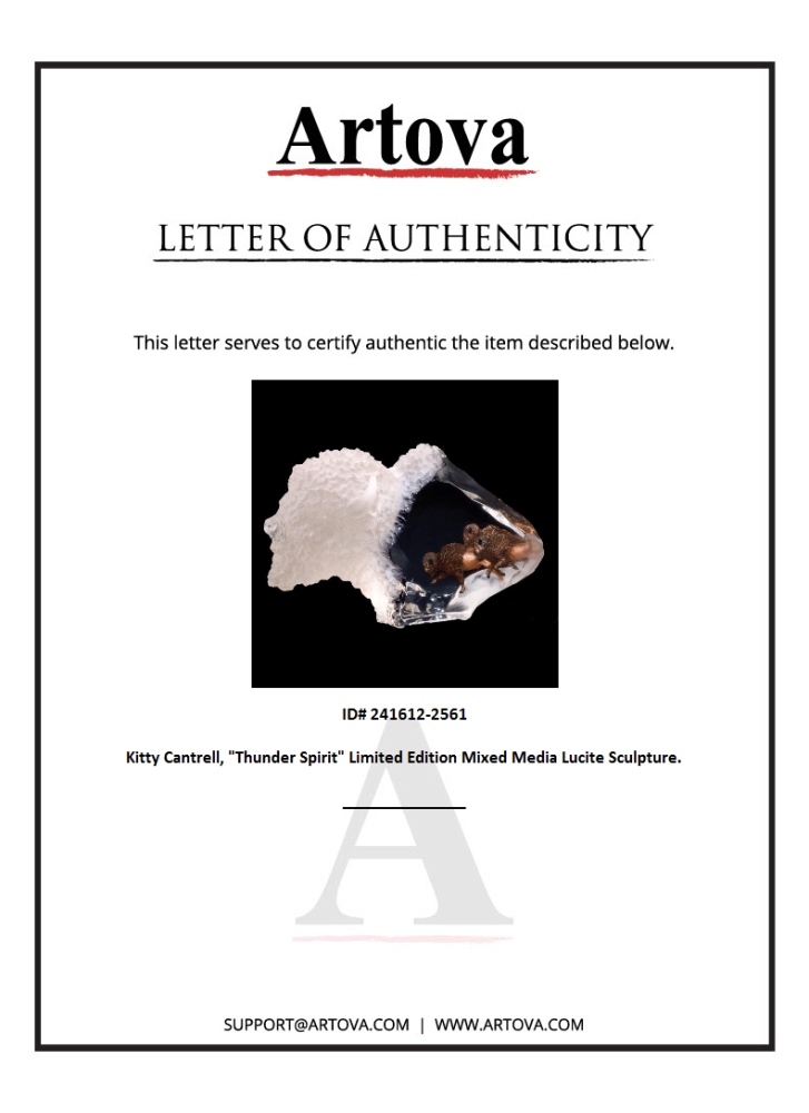 "Thunder Spirit" is an AP limited edition mixed media lucite sculpture by Kitty Cantrell. Engraved with the artists signature and number, this piece comes with a certificate of authenticity. Measures approximately 7.75" x 7" x 3.75".