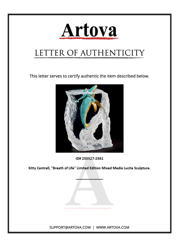 "Breath of Life" is a limited edition mixed media lucite sculpture by Kitty Cantrell. Engraved with the artists signature and number, this piece comes with a certificate of authenticity. Measures approximately 11" x 5" x 16". This item requires special handling and may have a longer than usual turnaround.