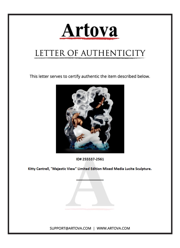 "Majestic View" is a limited edition mixed media lucite sculpture by Kitty Cantrell. Engraved with the artists signature and number, this piece comes with a certificate of authenticity. Measures approximately 12" x 5" x 14". This item requires special handling and may have a longer than usual turnaround.
