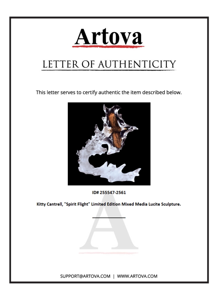 "Spirit Flight" is a limited edition mixed media lucite sculpture by Kitty Cantrell. Engraved with the artists signature and number, this piece comes with a certificate of authenticity. Measures approximately 15" x 7" x 14". This item requires special handling and may have a longer than usual turnaround.