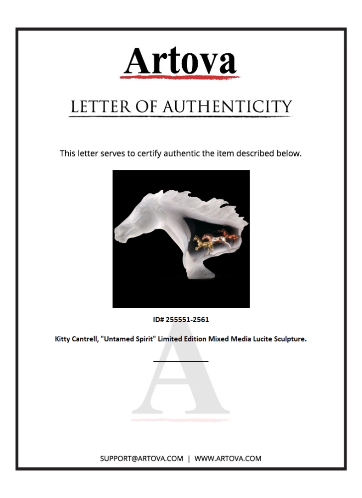 "Untamed Spirit" is a limited edition mixed media lucite sculpture by Kitty Cantrell. Engraved with the artists signature and number, this piece comes with a certificate of authenticity. Measures approximately 14" x 5" x 11". This item requires special handling and may have a longer than usual turnaround.