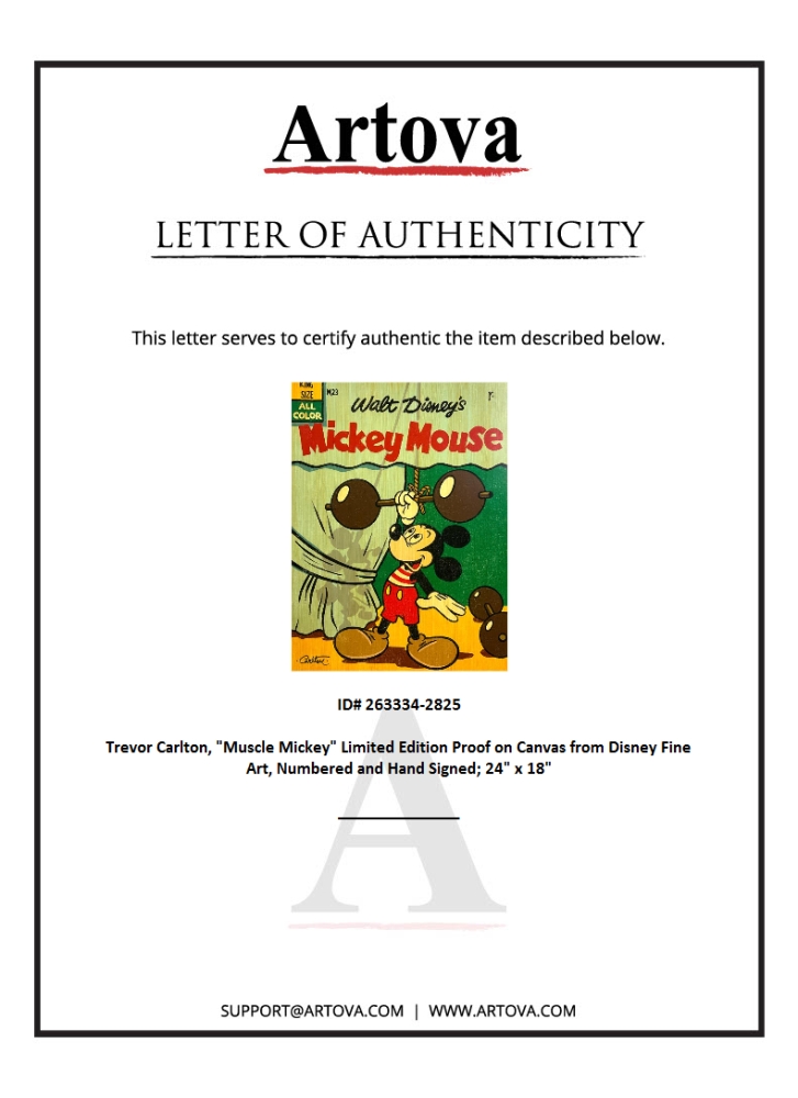 "Muscle Mickey" is a limited edition proof giclee on canvas by Trevor Carlton, numbered and hand signed by the artist. This piece is licensed by Disney Fine Art. Includes Letter of Authenticity. Measures approx. 18" x 24" (image).