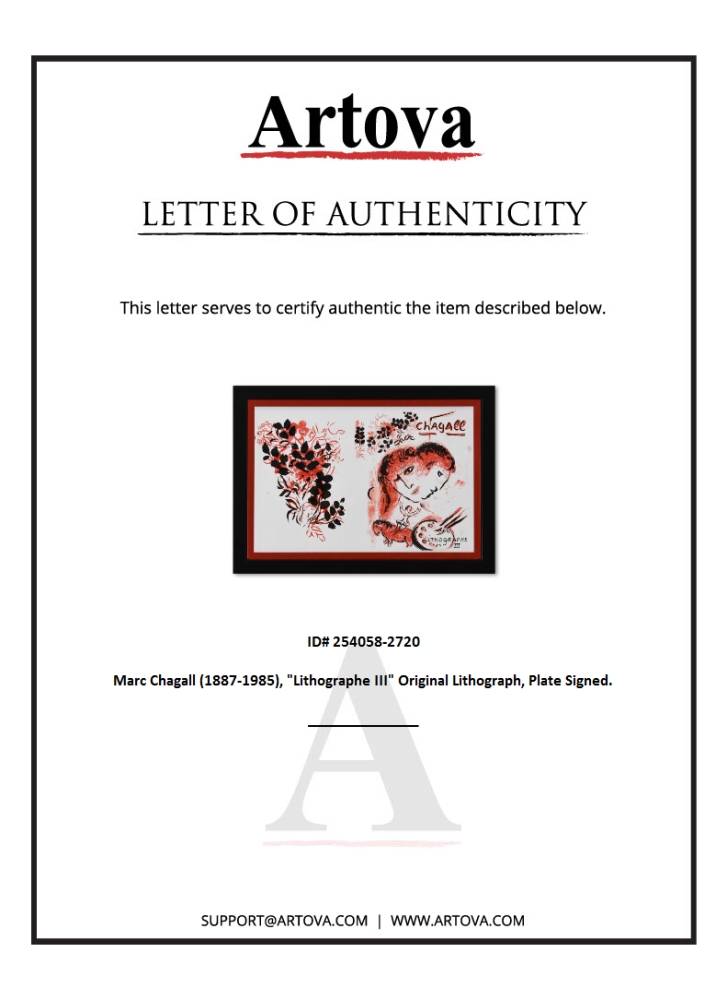 "Lithographe III" is an original lithograph on paper by Marc Chagall (1887-1985), bearing the plate signature of the artist. This piece comes custom framed. Includes Letter of Authenticity. Measures approx. 24" x 17" (frame), 20.5" x 13.5" (image).