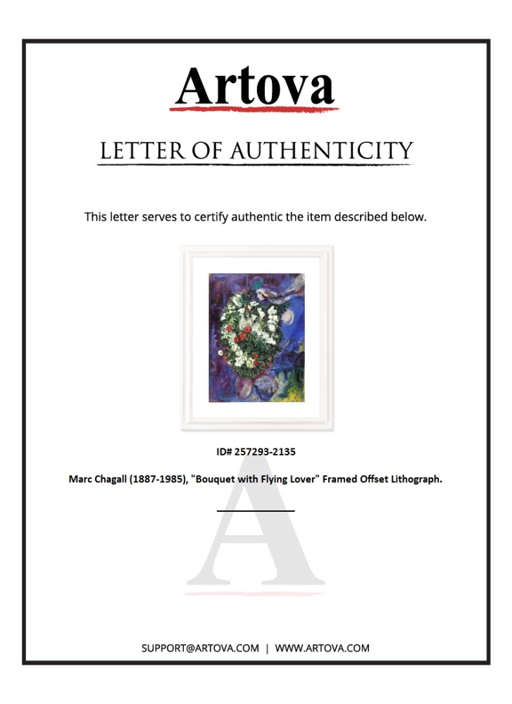 "Bouquet with Flying Lover" is an offset lithograph on paper by Marc Chagall (1887-1985). This piece was published as a poster for the Tate Gallery in London, England in 1985. This piece comes custom framed. Measures approx. 24.5" x 29.5" (frame), 15" x 20" (image).