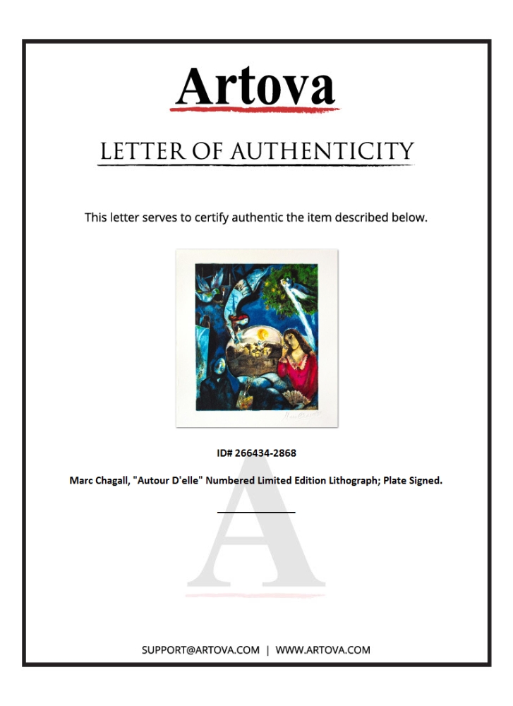 "Autour D'elle" is a limited edition lithograph on paper by Marc Chagall (1887-1985). Printed by Atelier Mourlot in Paris and authorized by the Chagall Estate and ADAGP Paris , the piece is plate signed and comes with a certificate of authenticity. Measures approximately 12.5" x 10.5" (image).