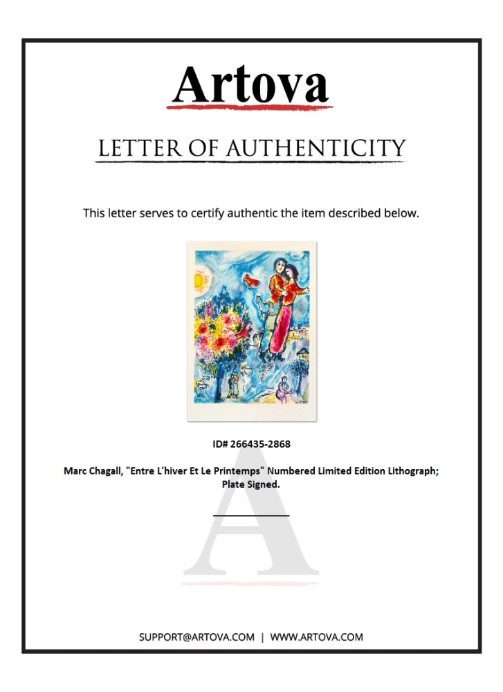 "Entre L'hiver Et Le Printemps" is a limited edition lithograph on paper by Marc Chagall (1887-1985). Printed by Atelier Tete a Tete in Paris and authorized by the Chagall Estate and ADAGP Paris , the piece is plate signed and comes with a certificate of authenticity. Measures approximately 14.5" x 11" (image).