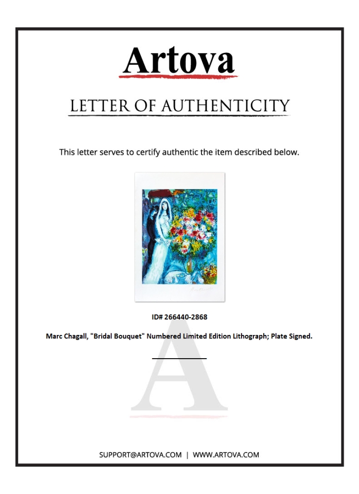 "Bridal Bouquet" is a limited edition lithograph on paper by Marc Chagall (1887-1985). Printed by Atelier Tete a Tete in Paris and authorized by the Chagall Estate and ADAGP Paris , the piece is plate signed and comes with a certificate of authenticity. Measures approximately 14.5" x 11.5" (image).