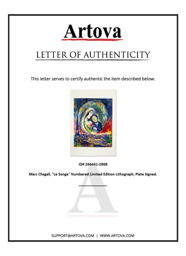 "Le Songe" is a limited edition lithograph on paper by Marc Chagall (1887-1985). Printed by Atelier Tete a Tete in Paris and authorized by the Chagall Estate and ADAGP Paris , the piece is plate signed and comes with a certificate of authenticity. Measures approximately 14.5" x 11.5" (image).