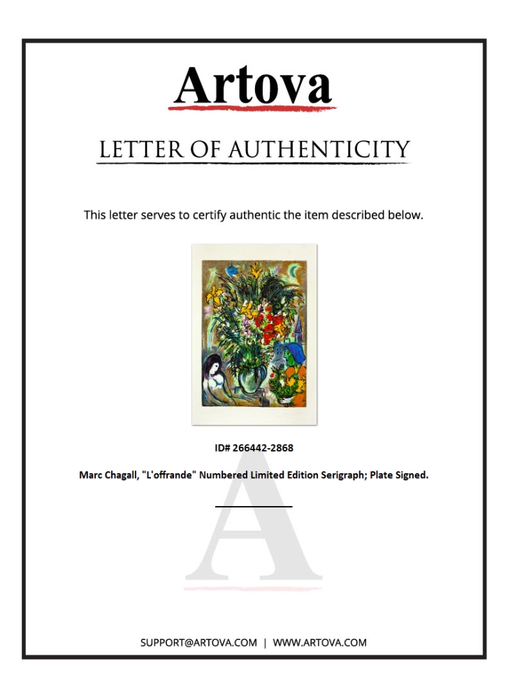 "L'offrande" is a limited edition serigraph on paper by Marc Chagall (1887-1985). Printed by Atelier Tete a Tete in Paris and authorized by the Chagall Estate and ADAGP Paris , the piece is plate signed and comes with a certificate of authenticity. Measures approximately 26.5" x 20.5" (image).