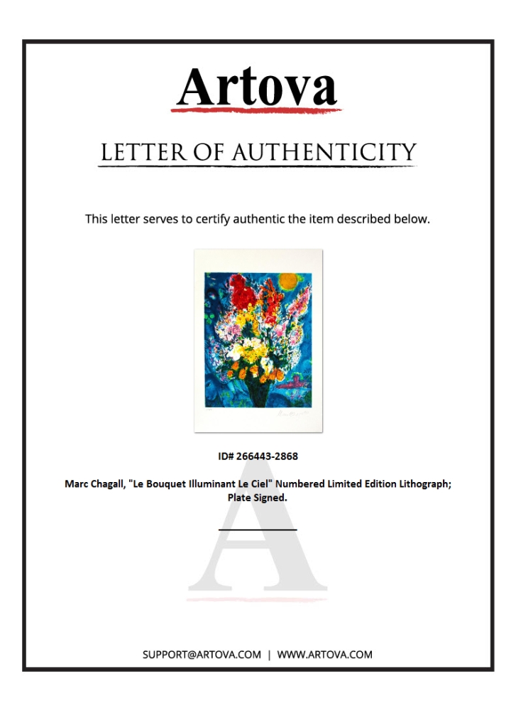 "Le Bouquet Illuminant Le Ciel" is a limited edition lithograph on paper by Marc Chagall (1887-1985). Printed by Atelier Tete a Tete in Paris and authorized by the Chagall Estate and ADAGP Paris , the piece is plate signed and comes with a certificate of authenticity. Measures approximately 14.5" x 11.5" (image).
