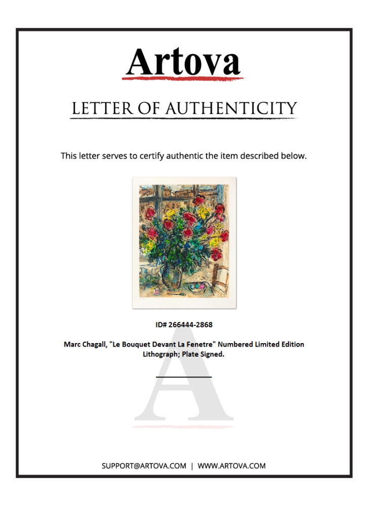 "Le Bouquet Devant La Fenetre" is a limited edition lithograph on paper by Marc Chagall (1887-1985). Printed by Atelier Tete a Tete in Paris and authorized by the Chagall Estate and ADAGP Paris , the piece is plate signed and comes with a certificate of authenticity. Measures approximately 20.5" x 16.5" (image).