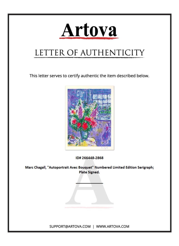 "Autoportrait Avec Bouquet" is a limited edition serigraph on paper by Marc Chagall (1887-1985). Authorized by the Chagall Estate and ADAGP Paris , the piece is plate signed and comes with a certificate of authenticity. Measures approximately 28" x 21" (image).