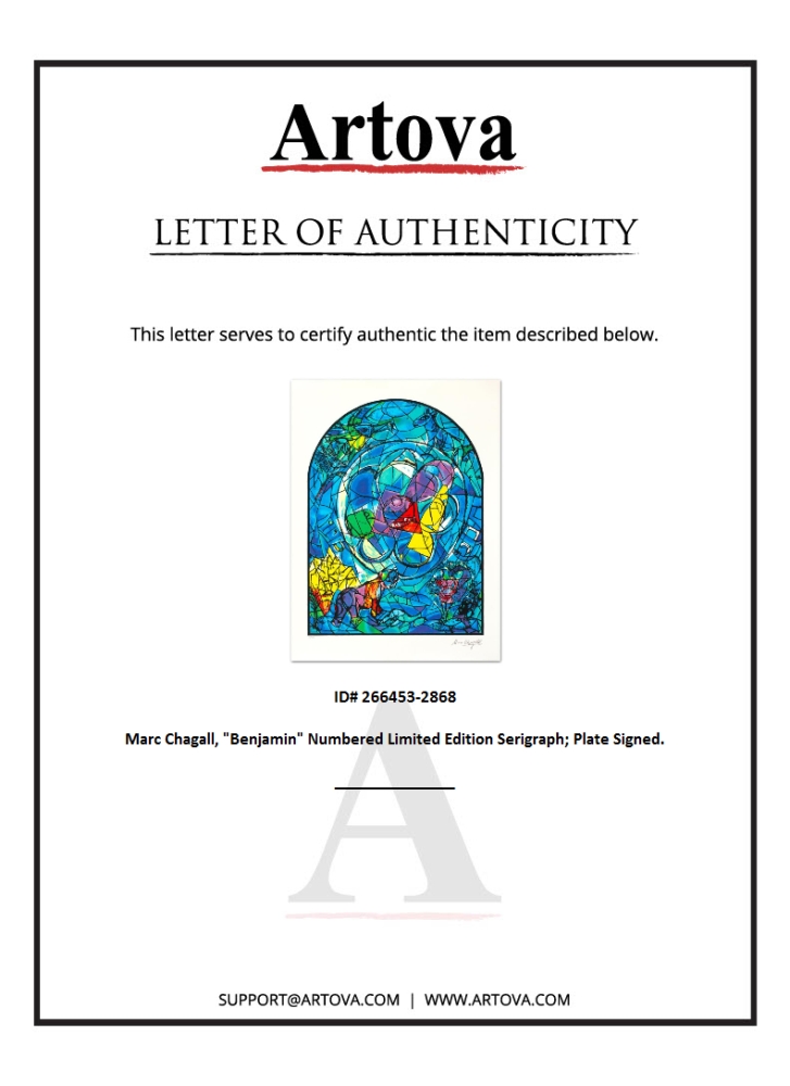 "Benjamin" is a limited edition serigraph on paper by Marc Chagall (1887-1985). Authorized by the Chagall Estate and ADAGP Paris , the piece is plate signed and comes with a certificate of authenticity. Measures approximately 27.5" x 21" (image).