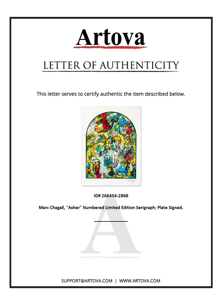 "Asher" is a limited edition serigraph on paper by Marc Chagall (1887-1985). Authorized by the Chagall Estate and ADAGP Paris , the piece is plate signed and comes with a certificate of authenticity. Measures approximately 27.5" x 21" (image).