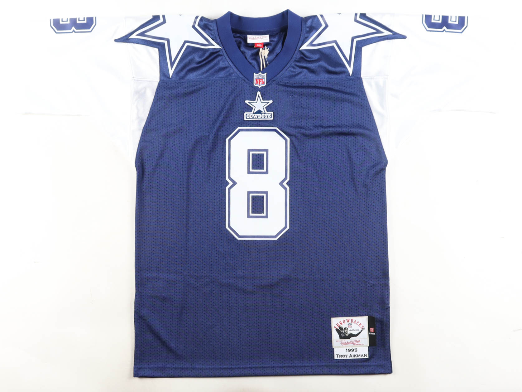 Mitchell & Ness jersey. Everything sewn on, size 44 (L). Hand-signed and inscribed by Troy Aikman (Dallas Cowboys, HOF).