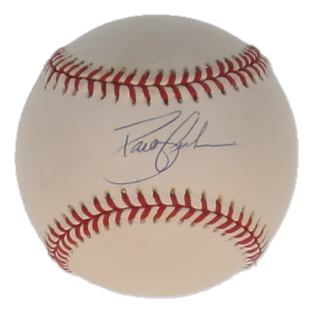 Rawlings Official National League Baseball. Hand-signed by David Justice (Atlanta Braves). Please note, the baseball is naturally toned and stained.