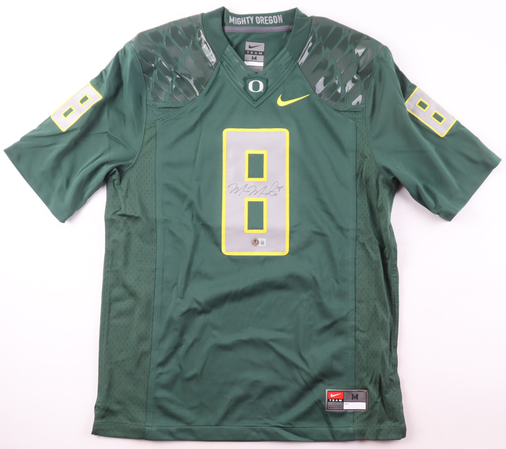 Nike jersey with everything sewn on, size M. Hand-signed by Marcus Mariota.