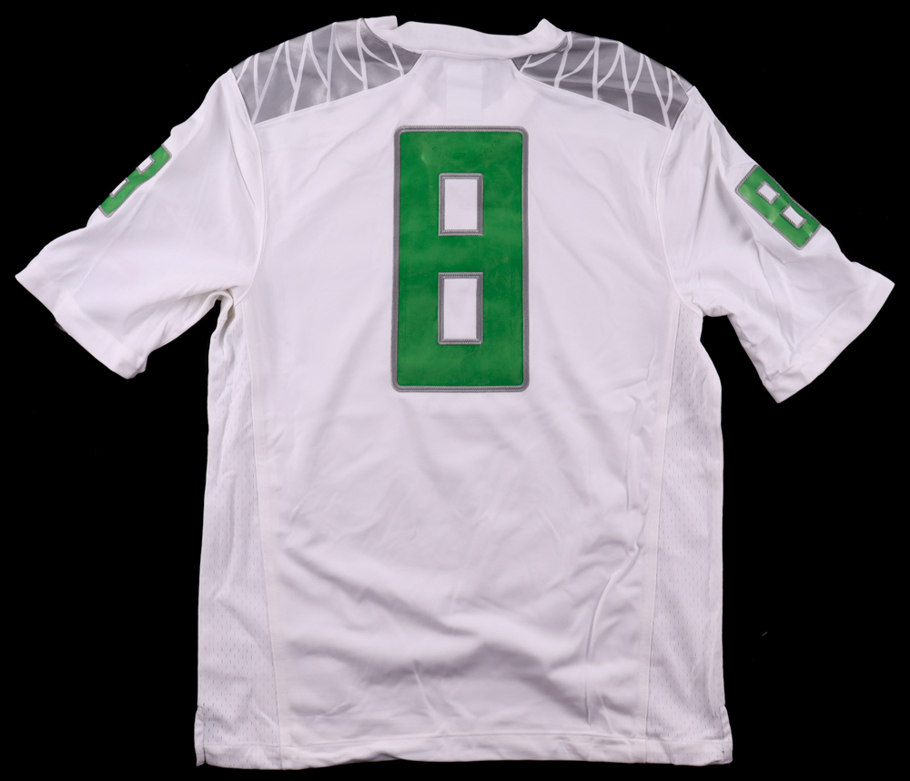 Nike jersey with everything sewn on, size M. Hand-signed by Marcus Mariota.